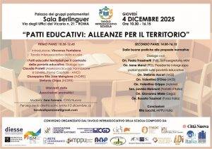 Giovedì 4 dicembre si svolge a Roma, presso il Palazzo dei Gruppi parlamentari “Patti educativi: alleanze per il territorio” il convegno promosso su iniziativa del Tavolo interassociativo della scuola. L’evento è incentrato sui Patti educativi di comunità, ovvero strumenti di cui si può dotare la scuola per costruire, con la collaborazione e il coinvolgimento di amministrazioni e/o altri soggetti (sia in forma singola che associata), reti, alleanze, scambi e metodi di apprendimento reciproci utili a innovare i programmi curriculari e i modelli educativi.